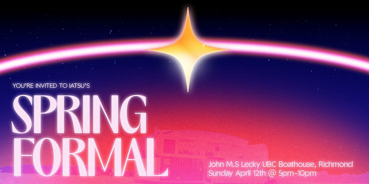 Join us at the UBC Boat House in Richmond on April 12th from 5pm - 10pm. Just a couple minutes walk from Arberdeen skytrain station, this year's spring formal will be AMAZING! Participate in fun events, win prizes, enjoy great food, and get a chance to wrap up the school year together. Only $30 per person.