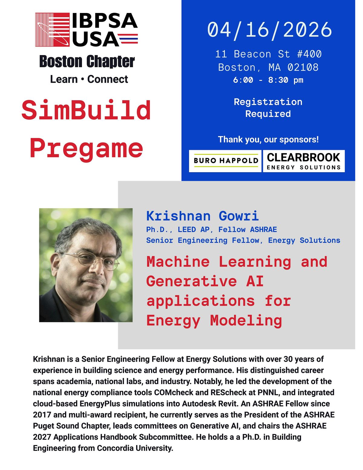 Join the IBPSA-USA Boston Chapter to "Learn & Connect" at our special SimBuild Pregame event! We are thrilled to host industry expert Krishnan Gowri for a deep dive into how artificial intelligence is transforming building performance analysis.