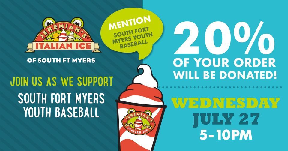 We would like to invite you to join us at our Jeremiah’s Ice Night on Wednesday, July 27th from 5-10pm. This event is a special opportunity to show your support of The South Fort Myers Youth Baseball’s 11U All Stars by indulging in tasty frozen treats! How sweet is that?! Simply drop by Jeremiah’s Italian Ice of South Ft Myers at 13401 Summerlin Rd and mention South Fort Myers Youth Baseball any time on Wednesday, July 27 to have 20% of your check donated directly to our organization! Please remember to mention our organization’s name at the window to ensure we receive credit for your support.