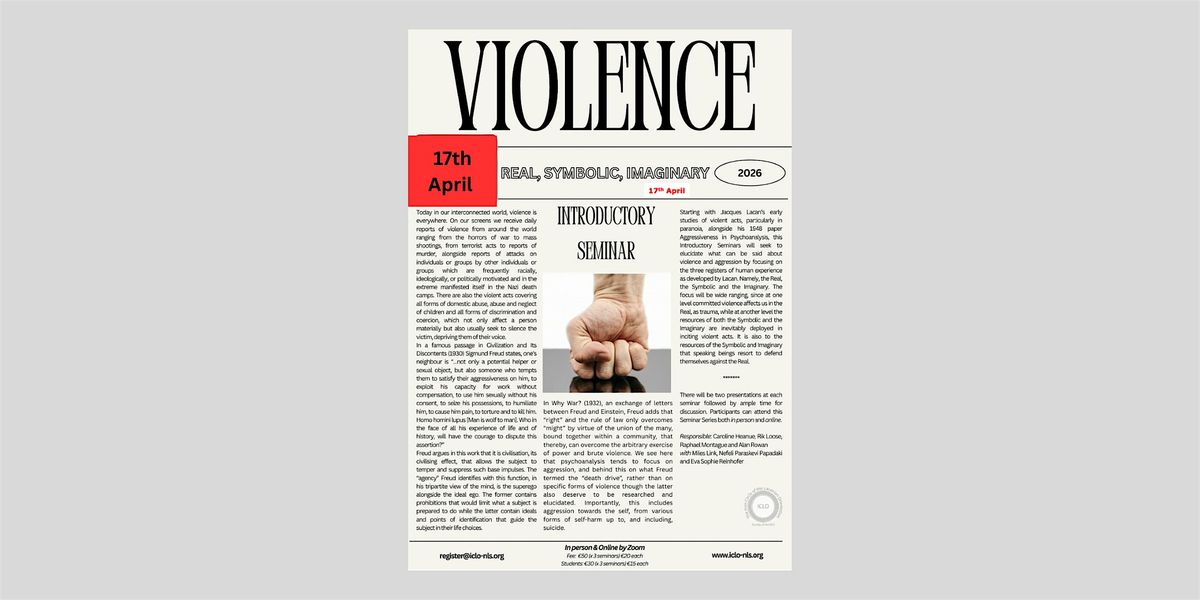 Starting with Jacques Lacan’s early studies of violent acts, particularly in paranoia, alongside his 1948 paper Aggressiveness in Psychoanalysis, this Introductory Seminars will seek to elucidate what can be said about violence and aggression by focusing on the three registers of human experience as developed by Lacan. Namely, the Real, the Symbolic and the Imaginary. The focus will be wide ranging, since at one level committed violence affects us in the Real, as trauma, while at another level the resources of both the Symbolic and the Imaginary are inevitably deployed in inciting violent acts. It is also to the resources of the Symbolic and Imaginary that speaking-beings resort to defend themselves against the Real.
