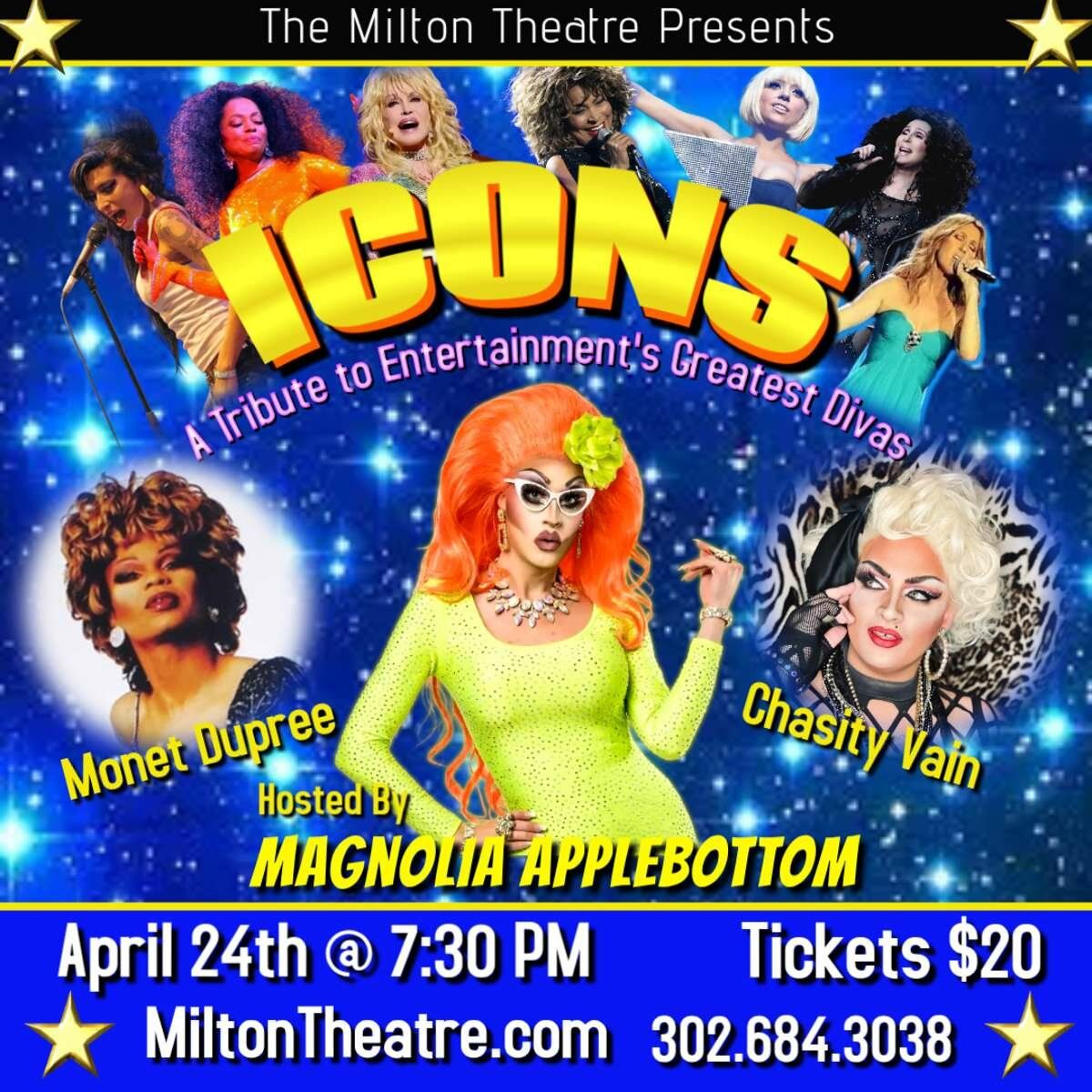 🌟 Step into a world of wonder at ICONS - A Tribute to Entertainment’s Greatest Divas, where extraordinary moments await! 🏛️ Located at The Milton Theatre in dynamic Milton, DE, this event will become the talk of the town. 📅 Join us on April 23rd, 2026 at 07:00 PM for a celebration that defies the ordinary. ✨ This curated experience brings together the best of entertainment, culture, and community spirit. Every detail has been thoughtfully planned to ensure an unforgettable experience for all our guests. 🎯 Take advantage of this opportunity to be part of something special. 🎊 Early registration is recommended as space is limited!http://maps.seatics.com/TheMiltonTheatre_Endstage2_2023-01-20_2023-01-20_0630_01202023_070316_SVGC_tn.png