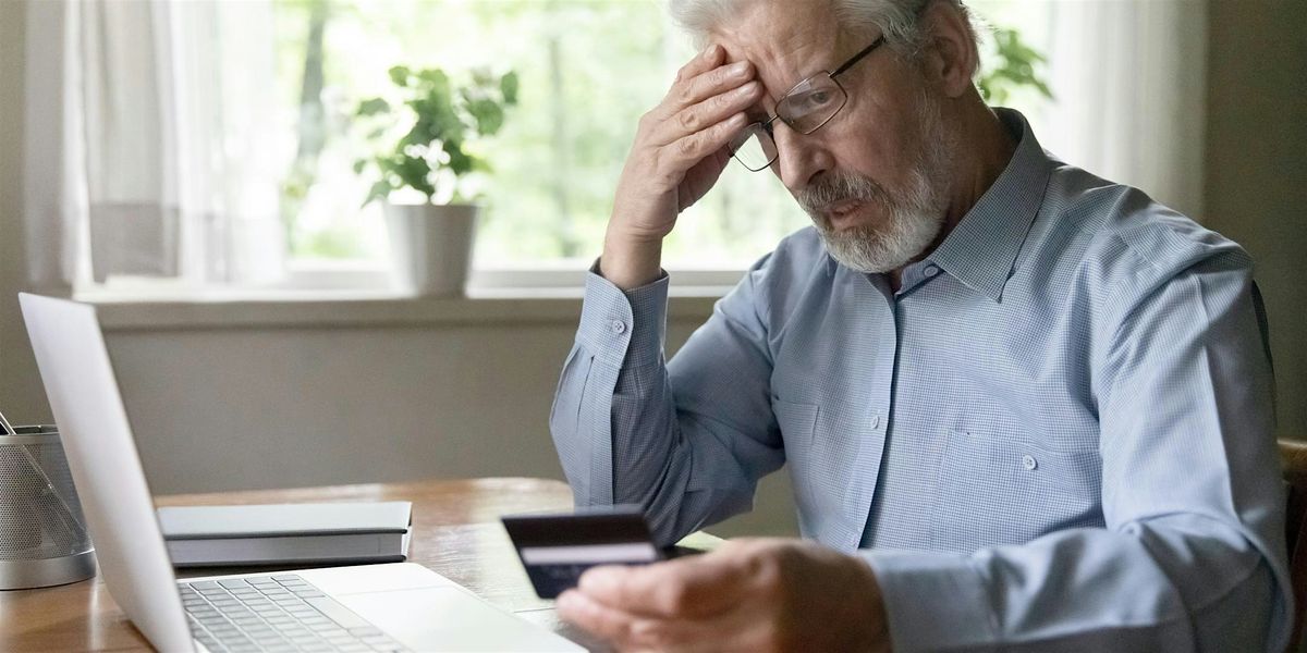 Image: An older person with white hair and glasses askew sits in front of a laptop looking worriedly at their credit card.