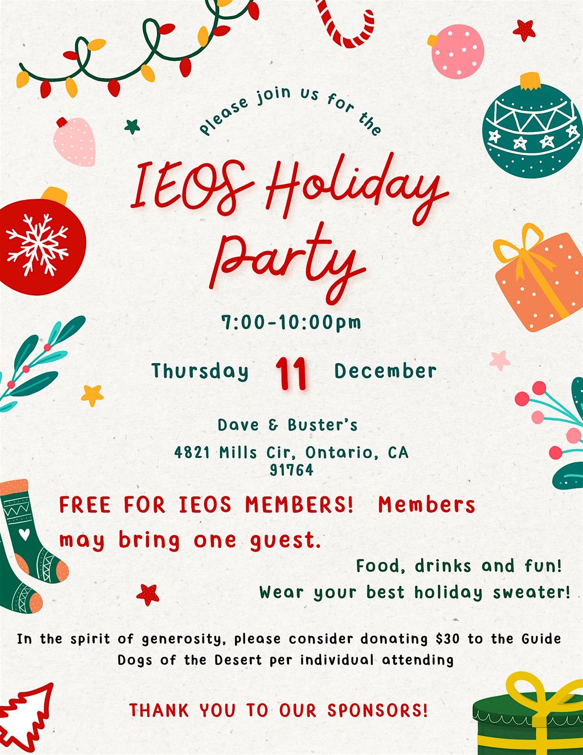 As a gesture of our gratitude, the IEOS board would like to invite you (plus a guest of your choice) to our FREE annual holiday party at Dave and Buster's in Ontario. There will be food, drinks, arcade games, and trivia! Wear your best holiday sweater!