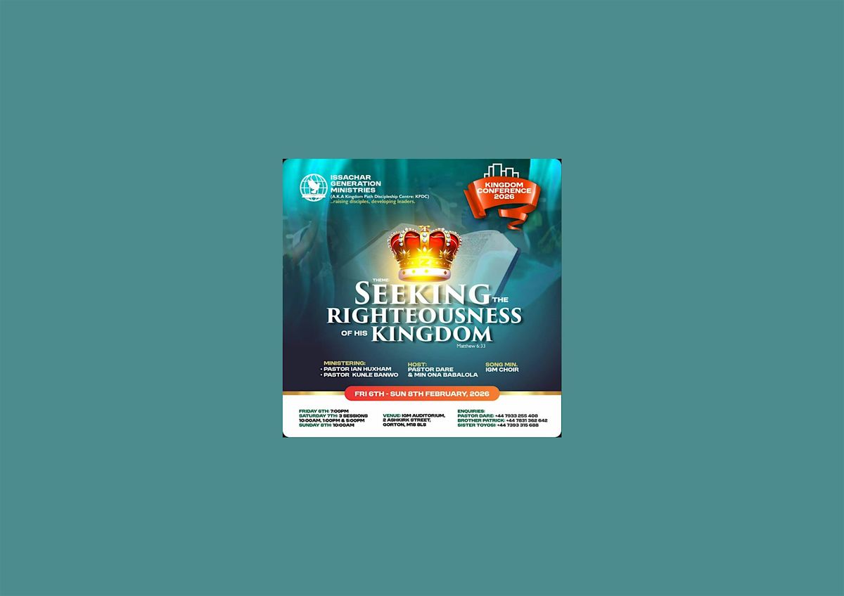 Issachar Generation Ministries is delighted to invite you to our Annual Kingdom Conference 2026, taking place from February 6–8, 2026. Taking place over the course of three days, this event is centered on the theme “Seeking the Righteousness of His Kingdom.”