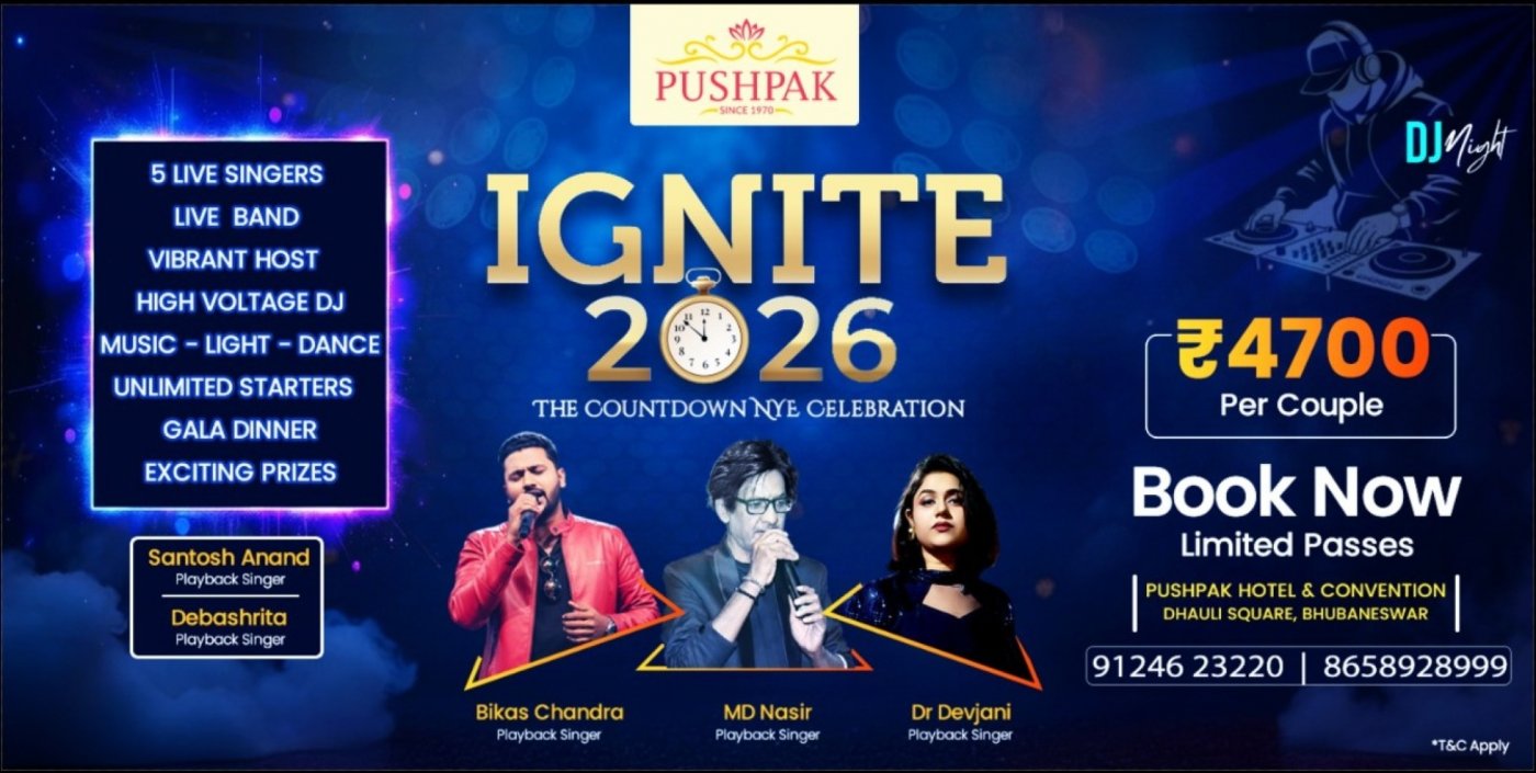 This New Year’s Eve, step into a night of music, glamour, and electrifying celebrations with IGNITE 2026 – The Countdown NYE Celebration at Pushpak Hotel & Convention, Dhauli Square.