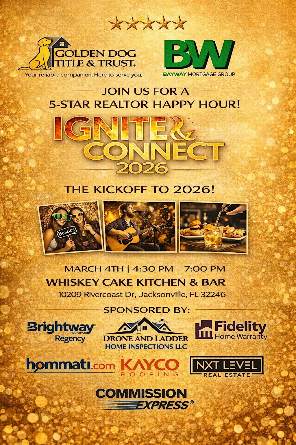 Hosted by Golden Dog Title & Trust, our 5-Star Realtor Happy Hour brings together real estate professionals and preferred vendors who know how to close strong and serve clients right.Come ignite new connections, strengthen existing relationships, and enjoy an unforgettable night with the people who help keep your business moving forward.