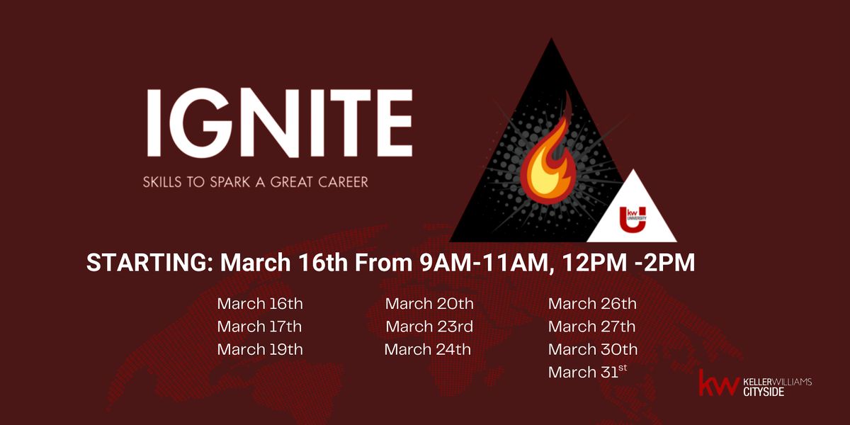 Ignite is open to ALL agents who are looking to (re)learn and strengthen their fundamentals within Keller Williams and real estate. From leveraging technology to harnessing the power of scripts, Ignite will take you from contact to contract to close. The course contains a wealth of foundational real estate content, enhanced by productivity-based exercises, an online tracking system, practical job aids, and powerful scripts. Ignite runs for eight weeks — Designed to get an agent their first appointment, with the goal of leading agents to a closed contract.