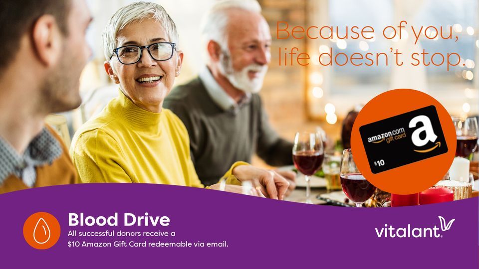 As a thank-you, all participants will receive a $10 Fandango Movie Voucher, $10 Amazon Gift Card*, a winter blood donor t-shirt* and automatically be entered into a drawing to win 1 of 3 $5,000 prepaid gift cards.