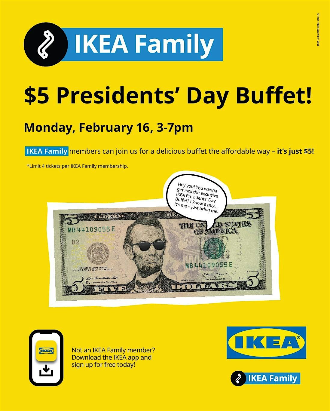 Join us at IKEA on Monday, February 16 from 3:00 PM to 7:00 PM for our IKEA Family $5 Presidents' Day Buffet in the Swedish Restaurant. For just $5, IKEA Family members can enjoy a fun, patriotic-themed meal featuring entrees, sides, desserts, and even a kids' menu!
