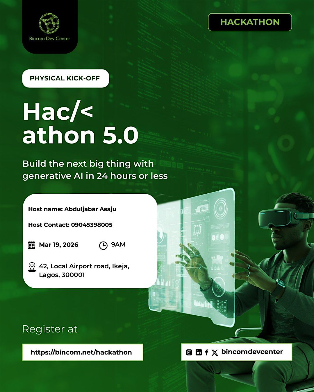 The Bincom Hackathon is a quarterly innovation-driven competition designed to foster creativity and problem-solving among individuals from diverse professional backgrounds, with a strong emphasis on technology careers. Participants with various skill sets come together to ideate, collaborate, and build functional solutions addressing real-world challenges.