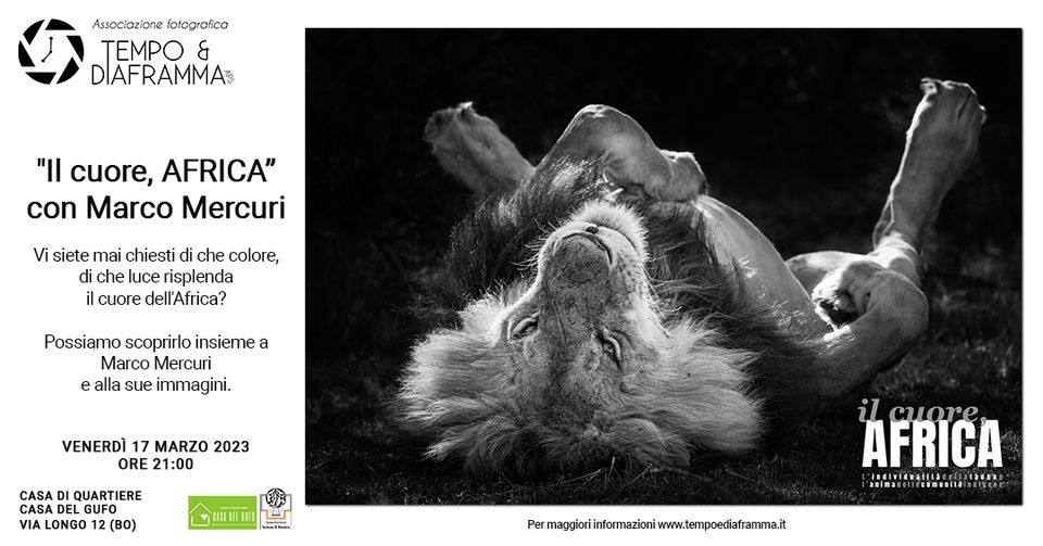 Vi siete mai chiesti di che colore, di che luce risplenda il cuore dell’Africa? Possiamo scoprirlo insieme a Marco Mercuri e alla sue immagini.L’Associazione Fotografica Tempo e Diaframma APS ha il piacere di ospitare Marco Mercuri con il suo progetto “Il cuore, AFRICA” per una serata dedicata alla fotografia naturalistica e ai suoi progetti sulla fauna e sulle comunità indigene dell’Africa.
