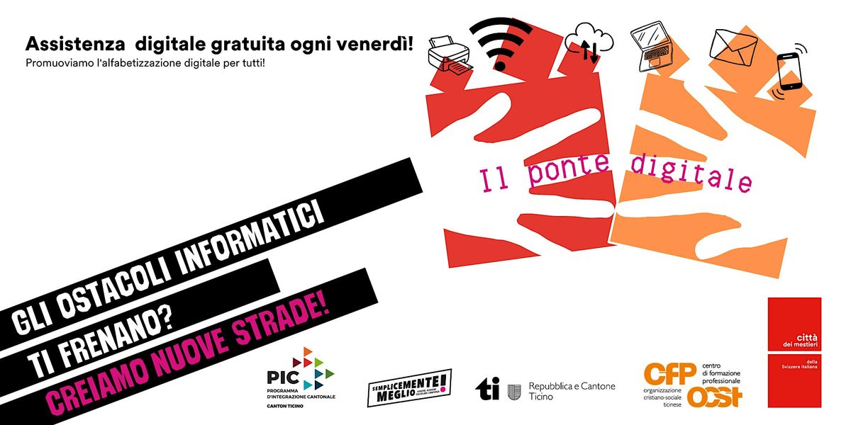 Sei alla ricerca di supporto per affrontare le tue sfide digitali? Il progetto "Ponte Digitale" è qui per aiutarti! Questo programma nasce dalla collaborazione tra la Città dei mestieri della Svizzera italiana, il Servizio per l'integrazione degli stranieri e il Centro di formazione professionale dell'OCST, ed è sostenuto dal Programma d’integrazione cantonale (PIC) e dalla campagna nazionale "Semplicemente meglio" nell’ambito della promozione delle competenze di base.