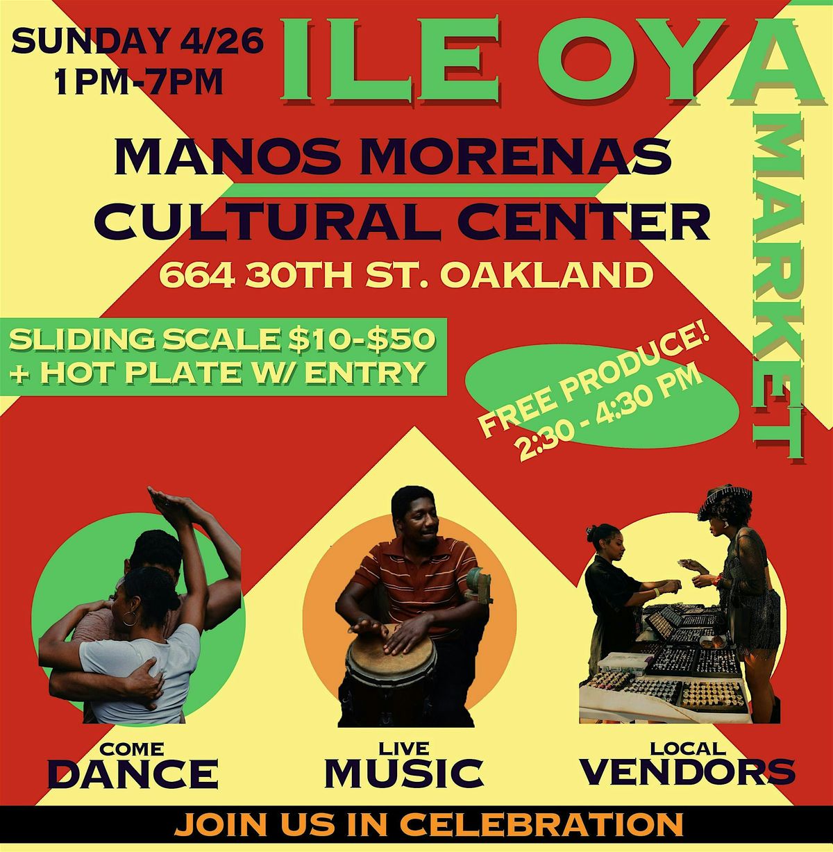 Ile Oya Market Sun Apr 26, 12–6PM! Dance, Eat, Shop, music all day, great food & free produce pickup at Manos Morenas Cultural Center.