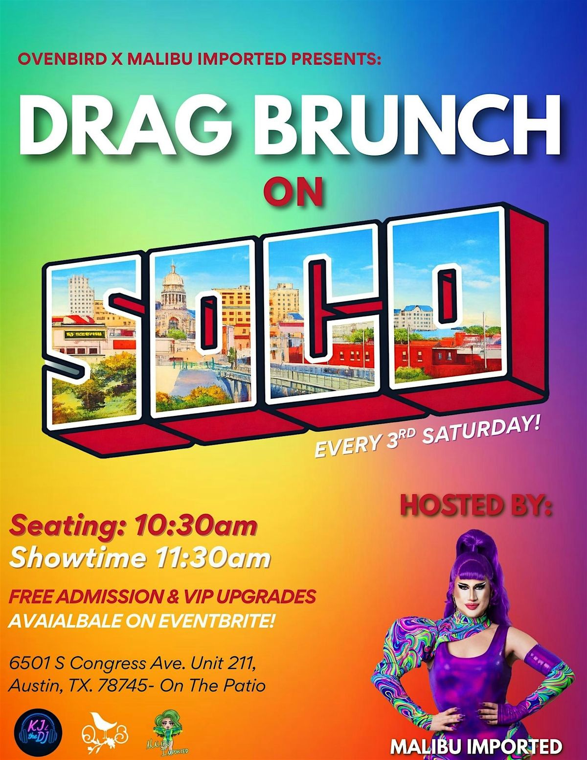 Join us on the iconic South Congress Avenue for Drag Brunch on SOCO, a vibrant patio party at Ovenbird featuring fierce drag performances, delicious brunch bites, and flowing drink specials—all set in the heart of one of Austin’s most historic districts. Hosted by Malibu Imported, this high-energy brunch pairs dazzling queens, a live DJ keeping the vibes up, and the unmistakable buzz of South Congress. Perfect for celebrating a special occasion or just brunching with friends!