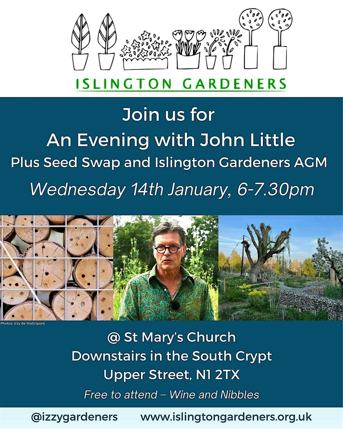 Come join us on Wednesday 14th January, 6-7.30pm at St Mary's Church on Upper Street (downstairs in the crypt) in the heart of Islington for an illustrated talk with John Little, seed giveaway and AGM. There will also be wine and nibbles. All are welcome!