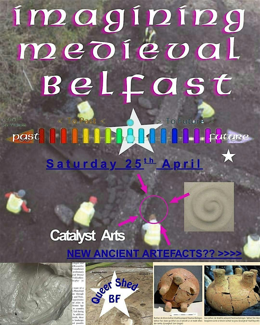Béal Feirste’s past is long and buried (literally). Artefacts from our oldest, and for some inconvenient, history have already been found beneath our buildings, shops and streets and Archaeologists believe that much more could still be buried for us to rediscover. Under the lives we live around town today, a whole Medieval world could wait. Join Queer Shed Béal Feirste for this decolonial history workshop to excavate and reimagine some of our earliest possibilities.