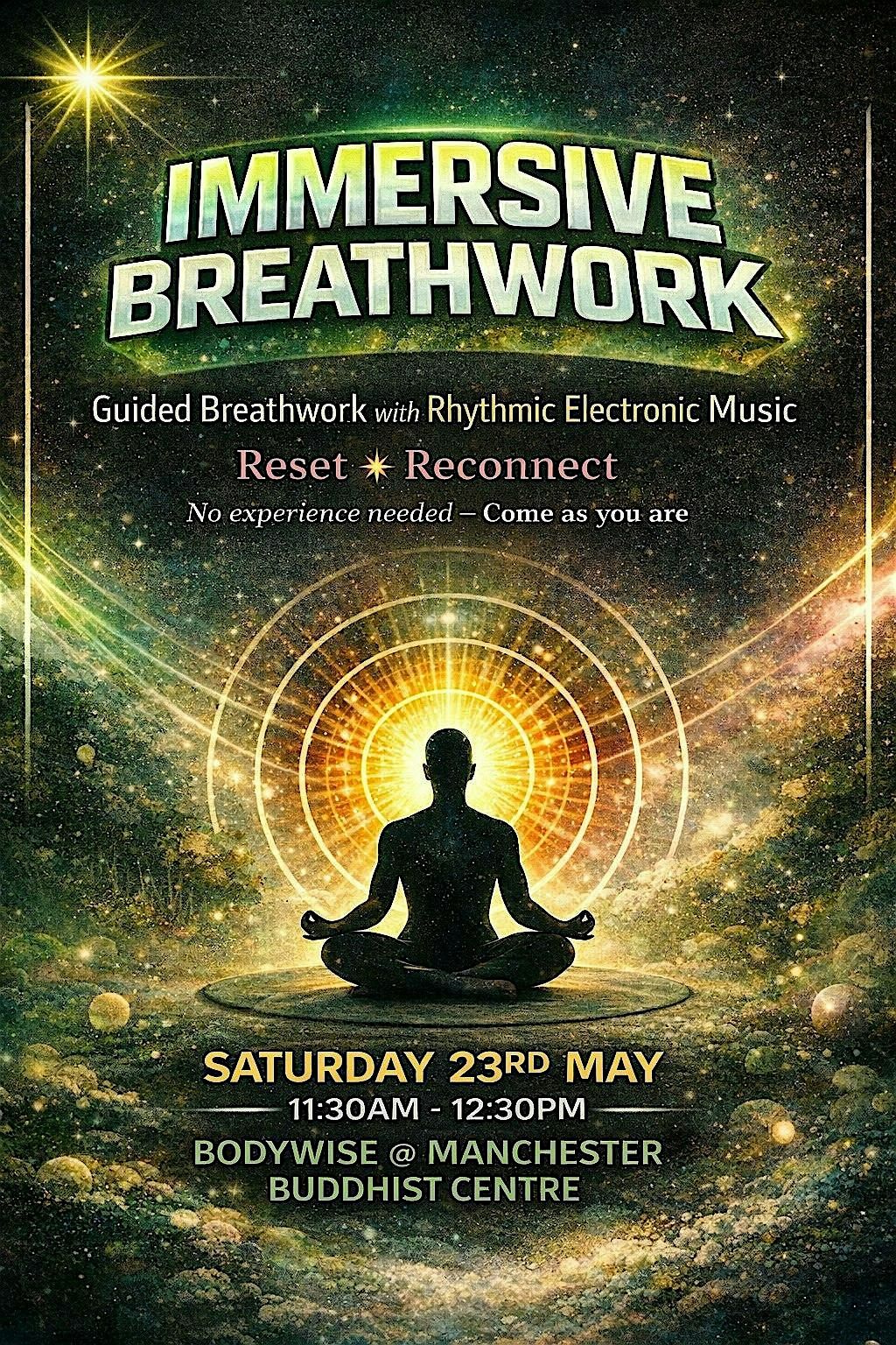 A guided breathwork session set to immersive electronic sound, focused on connecting to your breath and observing what unfolds. Through conscious connected breathing and a steady, rhythmic soundscape, you’ll be invited out of the thinking mind and into direct experience. This is not about forcing a specific outcome or chasing relaxation, it’s about allowing whatever arises to be there. Some people feel calm, others feel energised or emotional. All of it is welcome. No prior experience is needed, just come as you are. You’ll be supported throughout, with space at the end to rest and integrate. This is a simple but powerful way to reconnect with your body, your breath, and the present moment, without pressure or expectation. Mats provided, wear comfortable clothing, and bring water. Suitable for all levels.