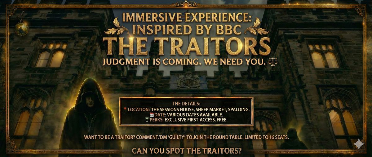 - The Traitors’ Bar: Our fully stocked bar will be open throughout the evening. Whether you need a glass of wine to celebrate a banishment or "liquid courage" to hide your guilt, we will keep your glass full.