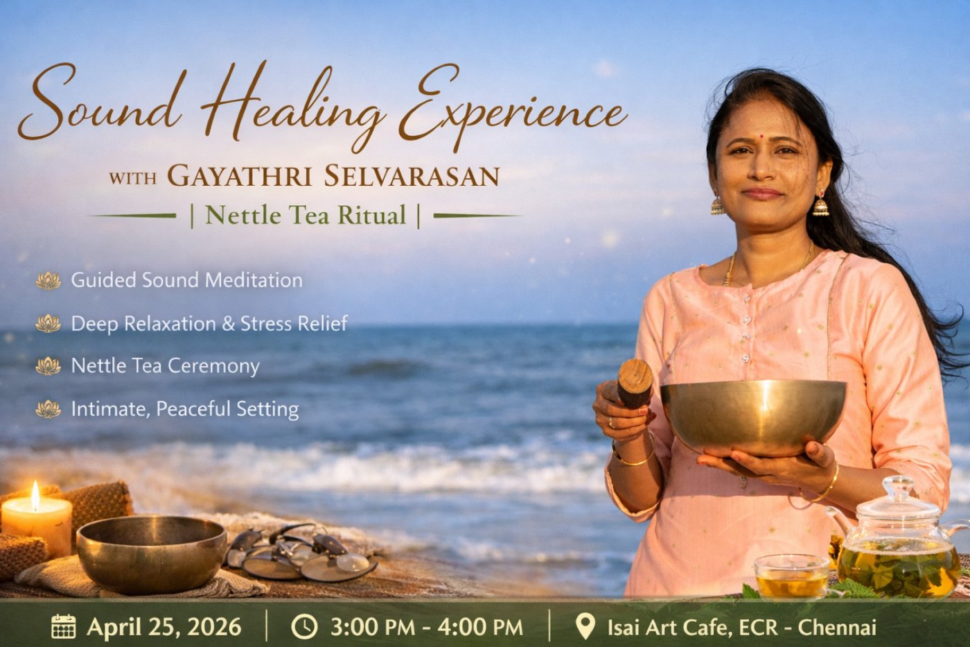 Join Gayathri Selvarasan – Sound & Energy Therapist for an immersive session designed to calm the mind, relax the body, and gently release stored stress through therapeutic sound vibrations.