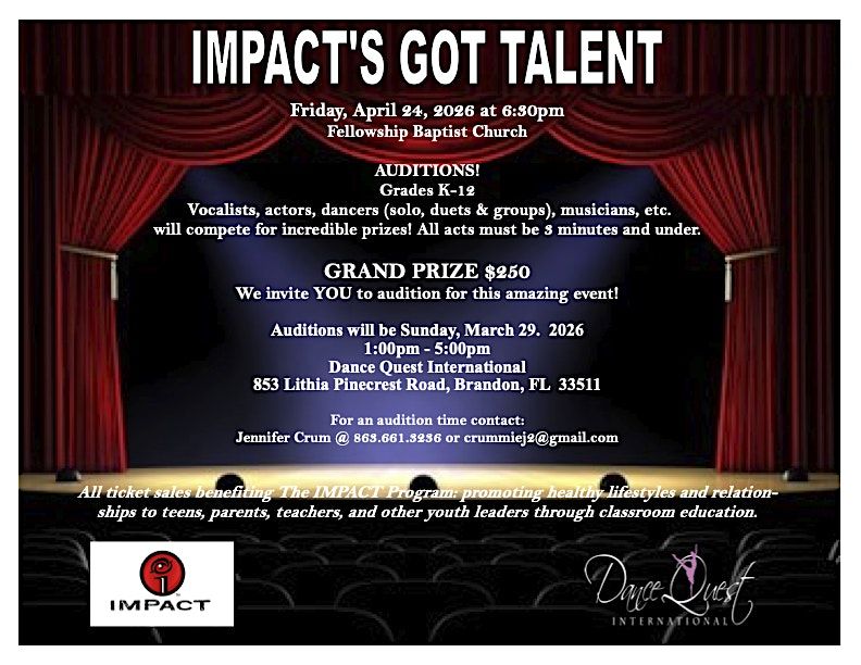 We are pleased to announce auditions for our 9th annual Impact's Got Talent 2026 event to be held on April 24th, 6:30pm at Fellowship Baptist Church of Thonotosassa! Grades K-12 are encouraged to audition for this fun-filled event. Singers, Dancers, Musicians, Theater, soloist, groups, talent of all kind -- we welcome you all at auditions!