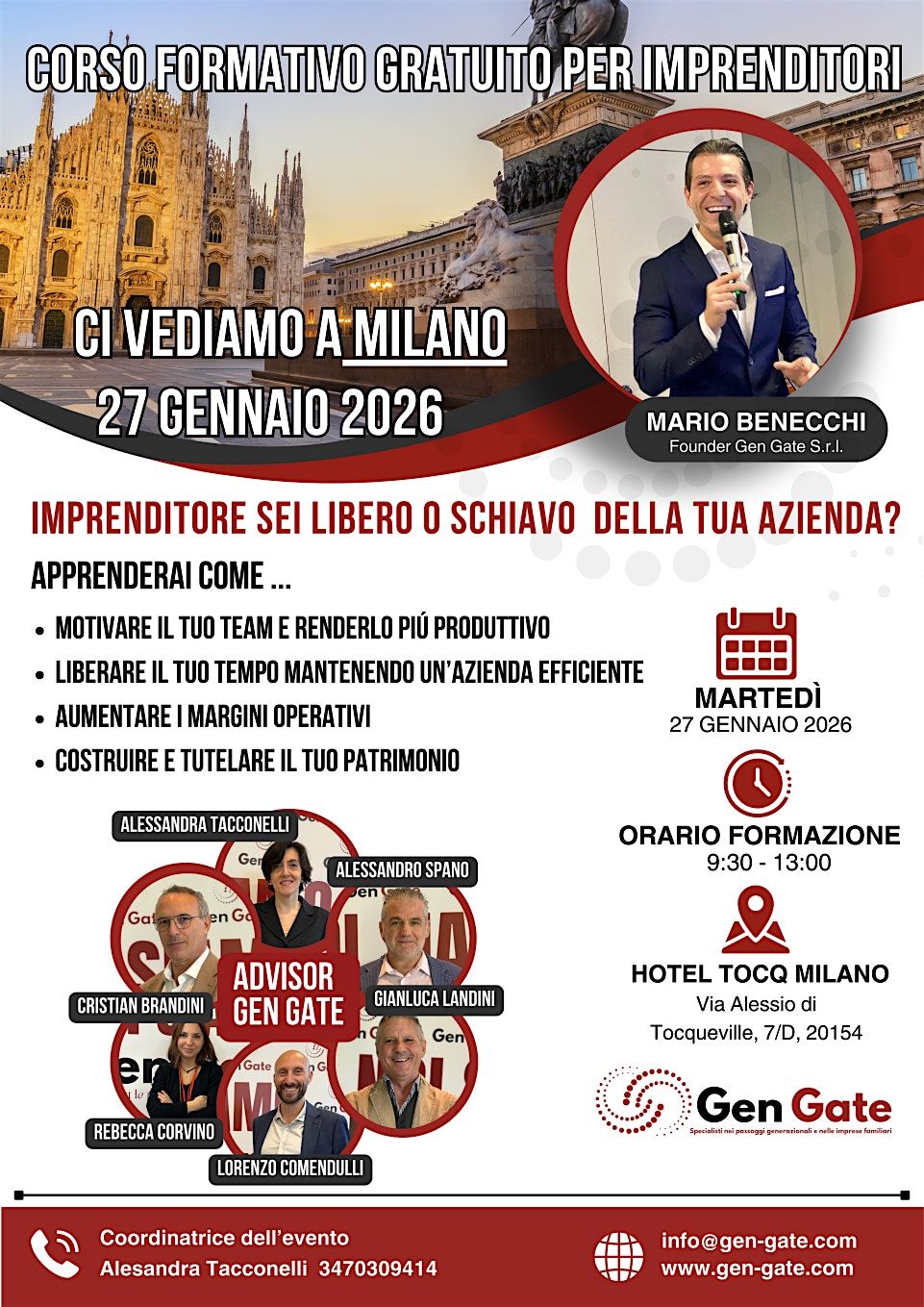 Martedì 27 gennaio 2026 sarai a Milano, all’Hotel Tocq, per un corso formativo gratuito guidato da Mario Benecchi e dal team Gen Gate, dedicato a imprenditori e famiglie imprenditoriali. Dalle 9:30 alle 13:00 lavorerai su strumenti pratici per smettere di essere il “tappo” della tua azienda, aumentare la produttività del tuo team e costruire oggi le basi di un domani sereno.