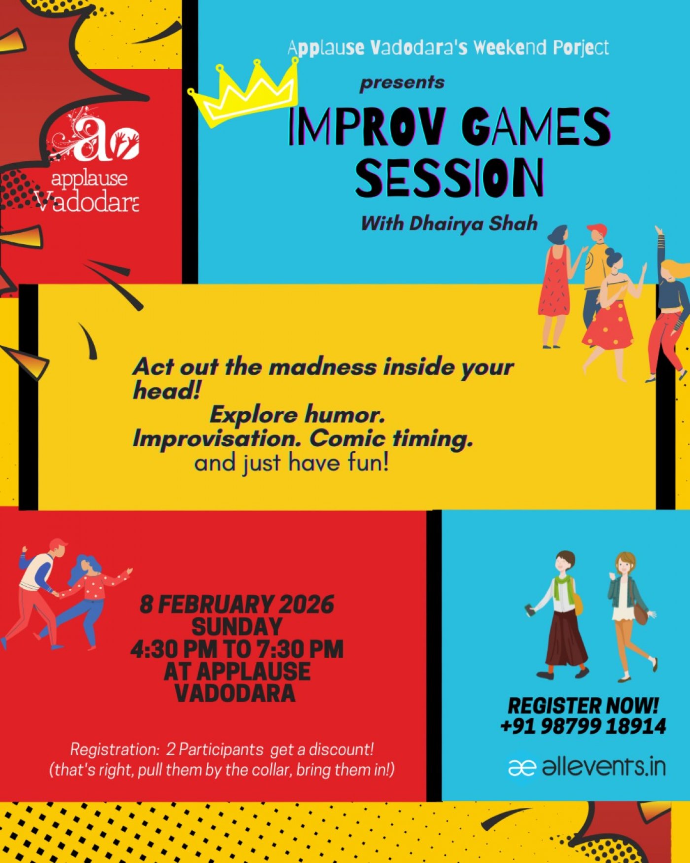 Applause Vadodaraย encourages an age-no-bar gender-no-bar language-no-bar type of association with theatre and art. Our mission is to create Innovative theatre Experiences that engage empower and entertain. We are Vadodara's first and most popular theatre initiative started in 2014.