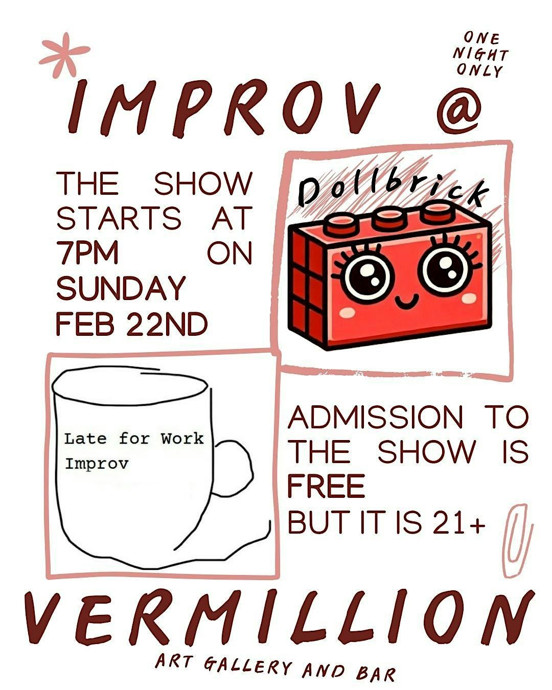 Join us for an unforgettable evening of improvisational comedy at Vermillion Art Gallery and Bar, featuring two of Seattle's dynamic improv ensembles: Dollbrick Improv Collective and Late for Work Improv. In this lively bar setting, both groups will deliver their unique styles of spontaneous storytelling and humor, each performing a set of their own. The night culminates in a collaborative performance, blending the talents of both troupes for an unscripted adventure filled with unexpected twists and laughter. Come prepared for a night of interactive entertainment where your suggestions shape the show!