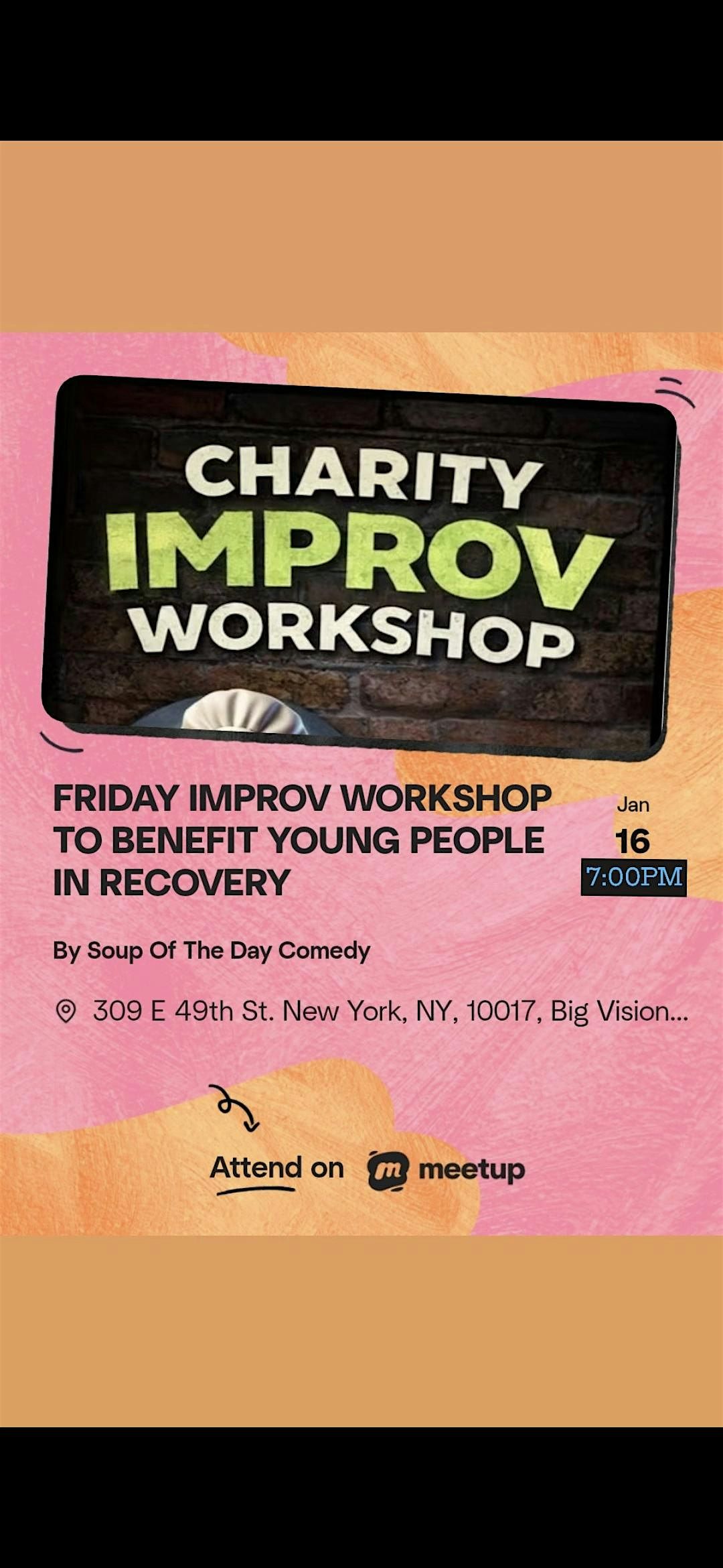 BIG VISION Is An NYC- Based Organization Dedicated To Working To For The Benefit Of Young People Putting In The Work And Effort To Stay Recovered From Substance Abuse. They Orgainze Events Of All Kinds And This Friday Soup Of The Day Comedy Collective's Head Chef Shawn Kinnear Will Be Running A 90 Minutr Improv Workshop Perfect For All Skill Levels!!! Especially Accessable For Beginners & Those Who Have NEVER Tried Improv, But With More Than Enough To Entertain And Flex The Muscles Of An Improv Regular! Event Is Free & All Donation Go To Helping Support BIG VISION In Their Mission To Assist Young People In Soberity Any Way They Can, So Join Us!!