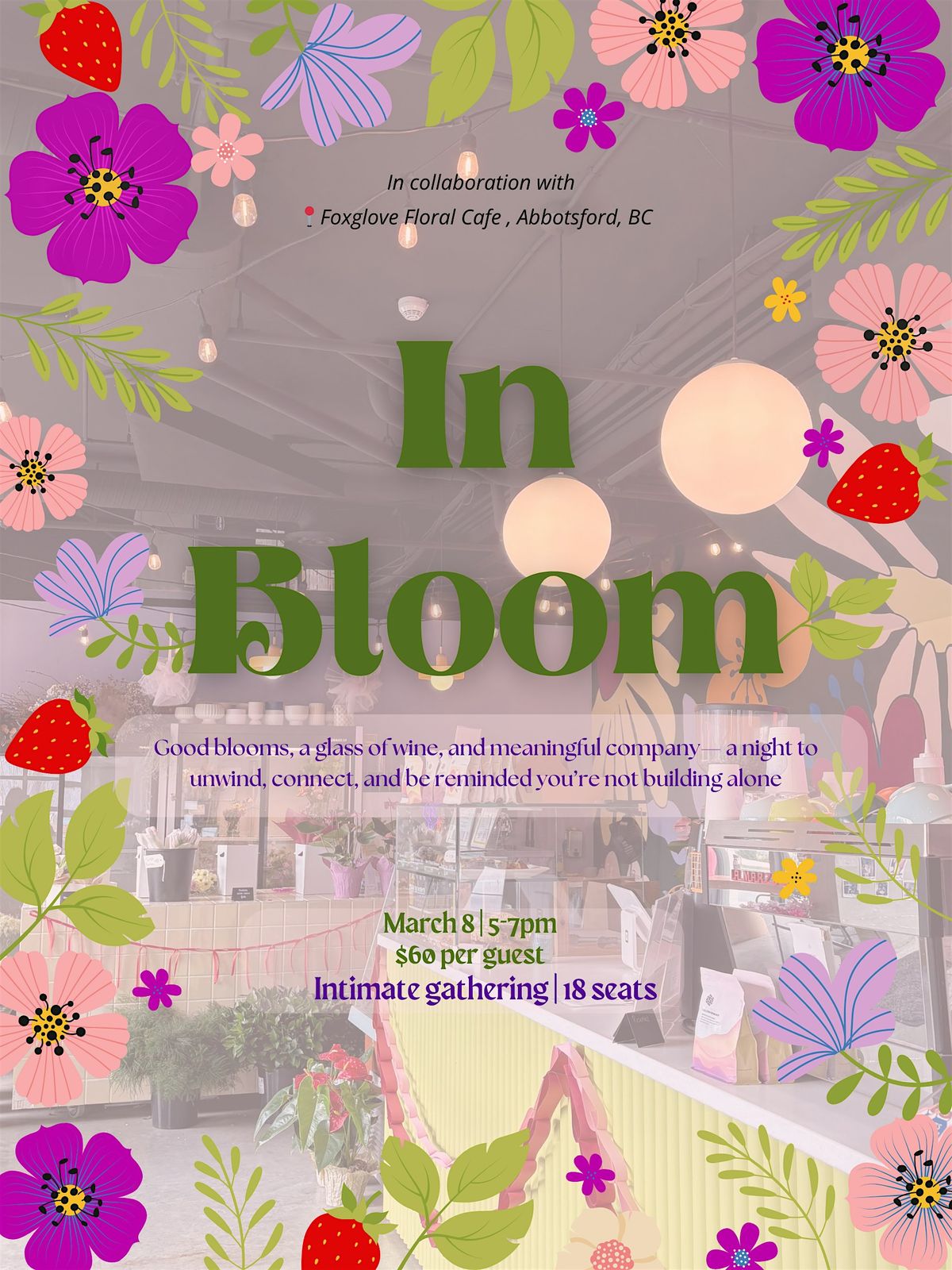 Join us for In Bloom, a spring gathering for young entrepreneurs and creatives craving real connection. Hosted at a dreamy floral cafe, you'll sip wine, build your own mini bouquet at the self-serve flower bar, and connect through thoughtfully curated conversation (no awkward networking here).