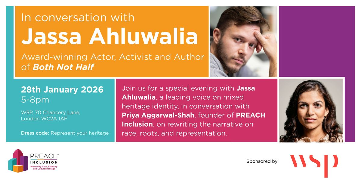 Join us for a special evening with Jassa Ahluwalia, a leading voice on mixed heritage identity, in conversation with Priya Aggarwal-Shah, founder and director of PREACH Inclusion, on rewriting the narrative on race, roots, and representation.