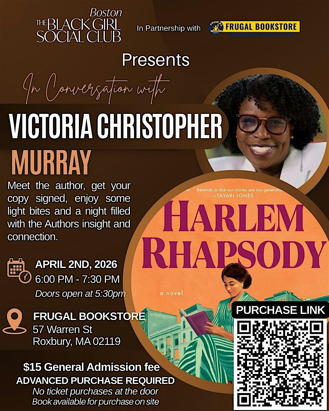 Join The Black Girl Social Club- Boston Chapter in partnership with Frugal Bookstore for an unforgettable evening with , celebrated author and NAACP Image Award winner, as she discusses her powerful latest release, Harlem Rhapsody. This facilitated conversation will explore the inspiration, historical depth and resonant themes behind the novel- spotlighting Black brilliance, womanhood, ambition and legacy.