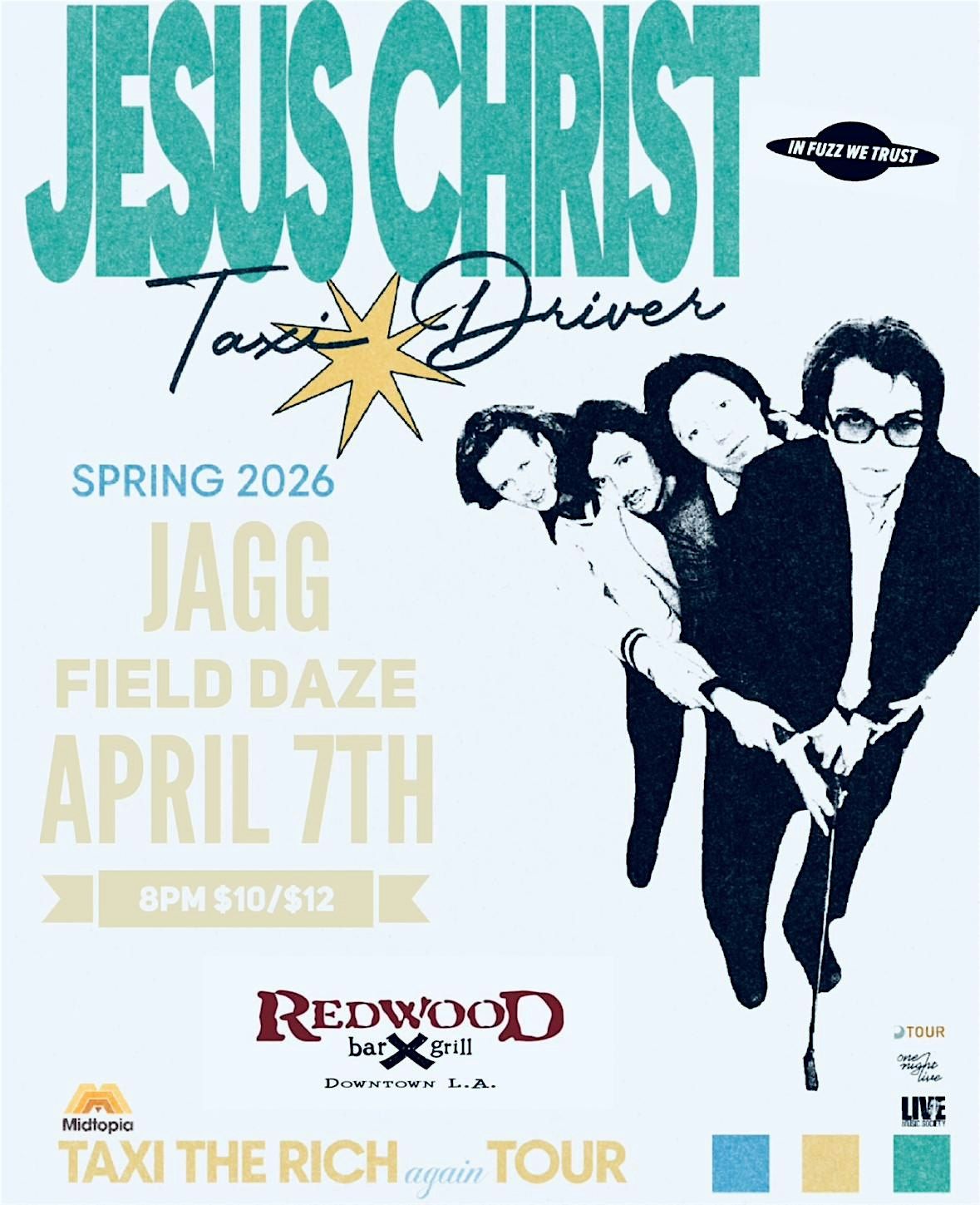 In Fuzz we Trust Presents Jesus Taxi Driver April 7th at the Redwood Bar w/ Jagg & Field Daze