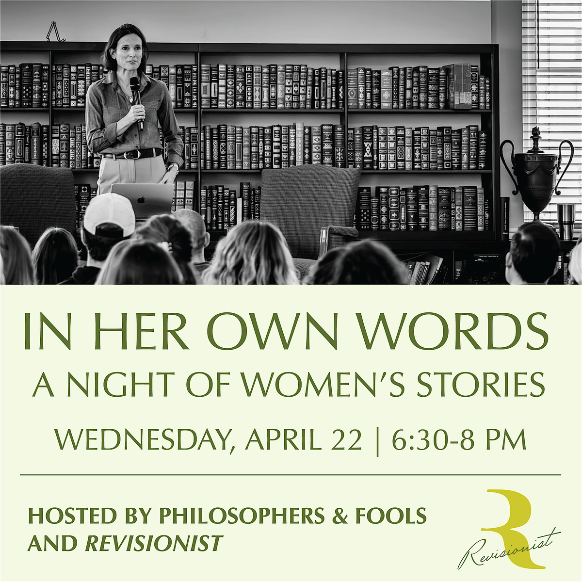 Join us for In Her Own Words; A Night of Women’s Stories, hosted by Philosophers & Fools and the 2026 edition of Revisionist, a magazine of female writers, artists, and culinarians.