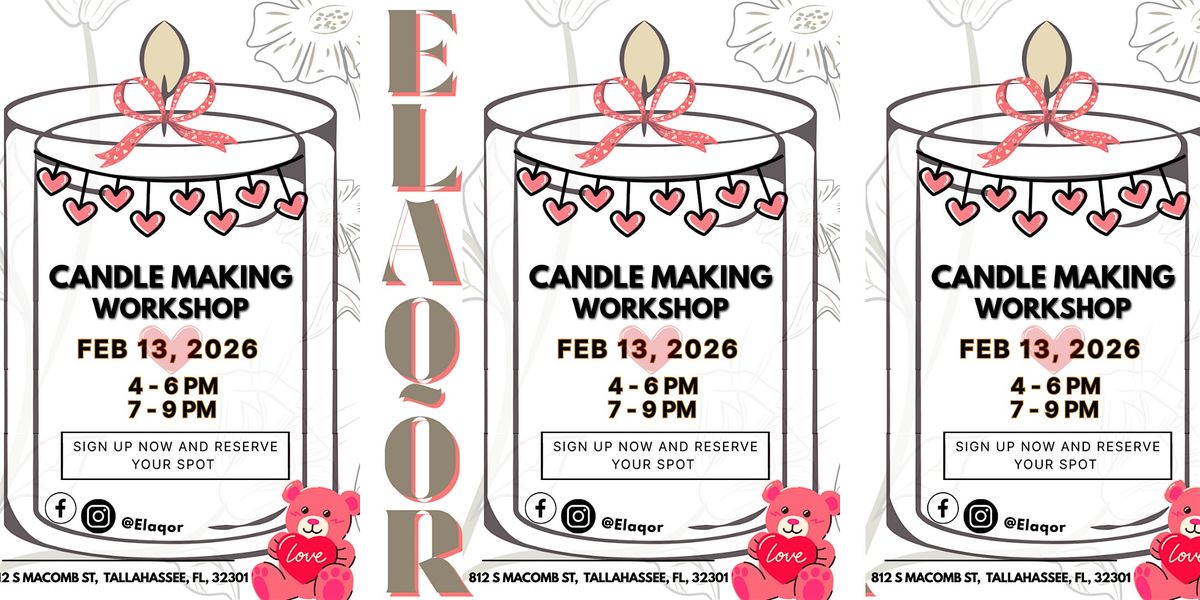 Welcome to Elaqor's Beginner's Candle Making Workshop! There’s no better time than the present to try your hand at mastering the art of candle-making with Amber, right here in Tallahassee! Located at 812 S Macomb St, Tallahassee, Fl, 32301.
