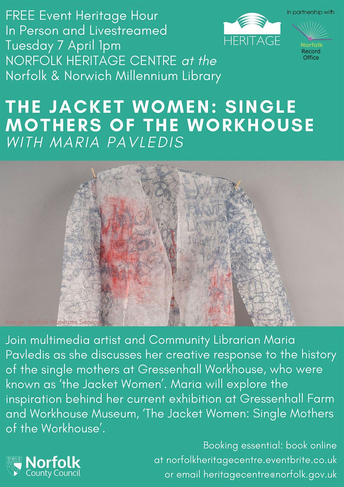 Join multimedia artist and Community Librarian Maria Pavledis as she discusses her creative response to the history of the single mothers at Gressenhall Workhouse, who were known as ‘the Jacket Women’. Maria will explore the inspiration behind her current exhibition at Gressenhall Farm and Workhouse Museum, ‘The Jacket Women: Single Mothers of the Workhouse’.