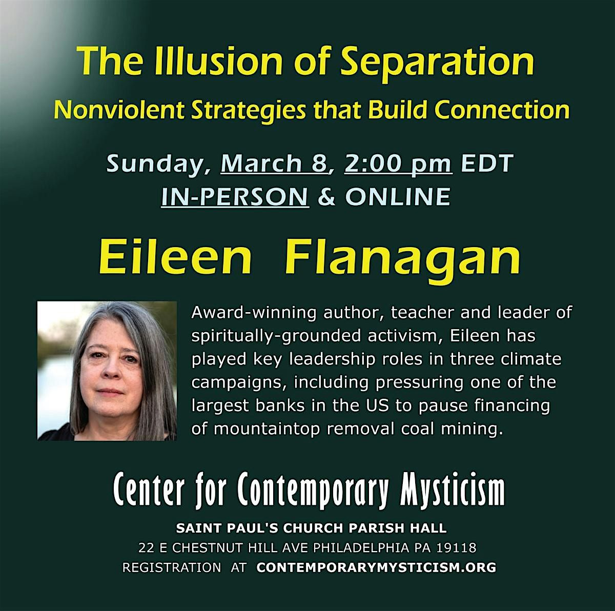 Join Quaker activist, EILEEN FLANAGAN, in-person as she shares environmental direct-action in forming coalitions that make a difference!About this Event