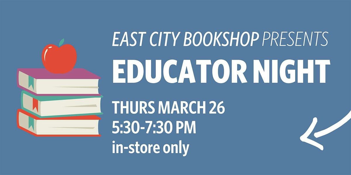 Educator Night at East City Bookshop is back! Join us on Thursday, March 26th from 5:30-7:30 PM to enjoy drinks, snacks, and a special 20% in-store discount on purchases for your classrooms. There are limited spaces available and you must register in order to attend.