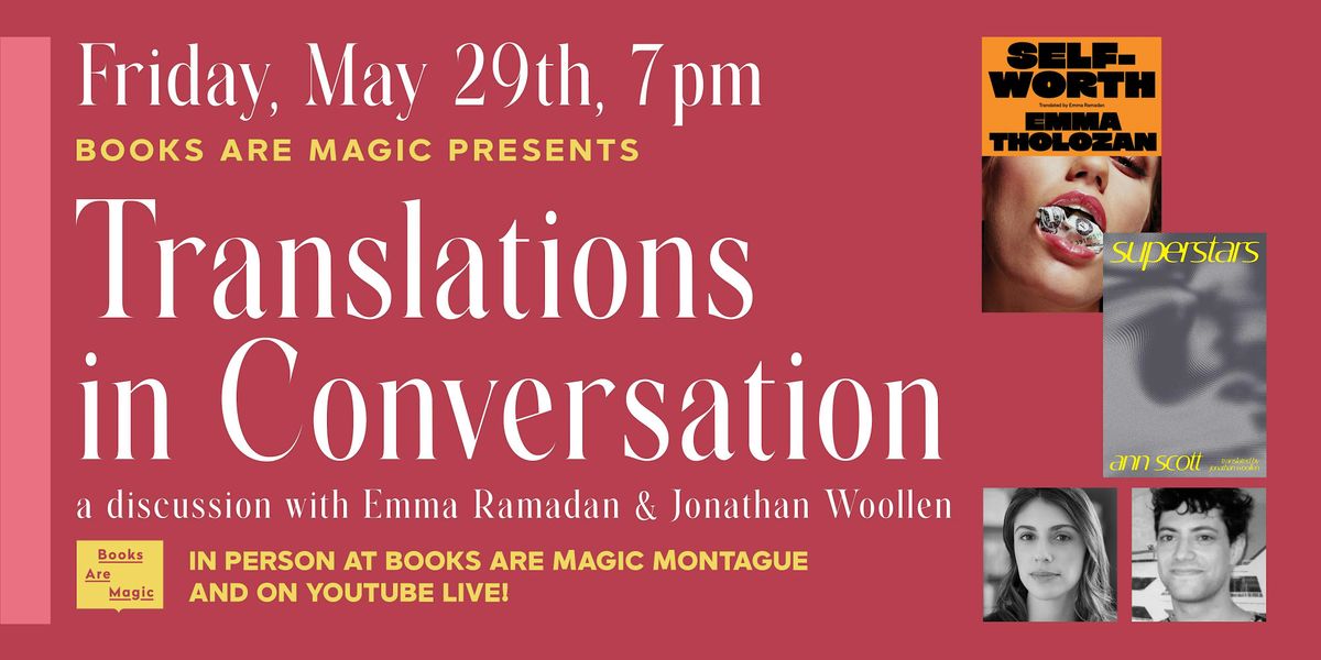Join us for a conversation featuring the translators of two brand-new novels in translation: Self-Worth, written by Emma Tholozan, trans. Emma Ramadan, and Superstars, written Ann Scott, trans. Jonathan Woollen.