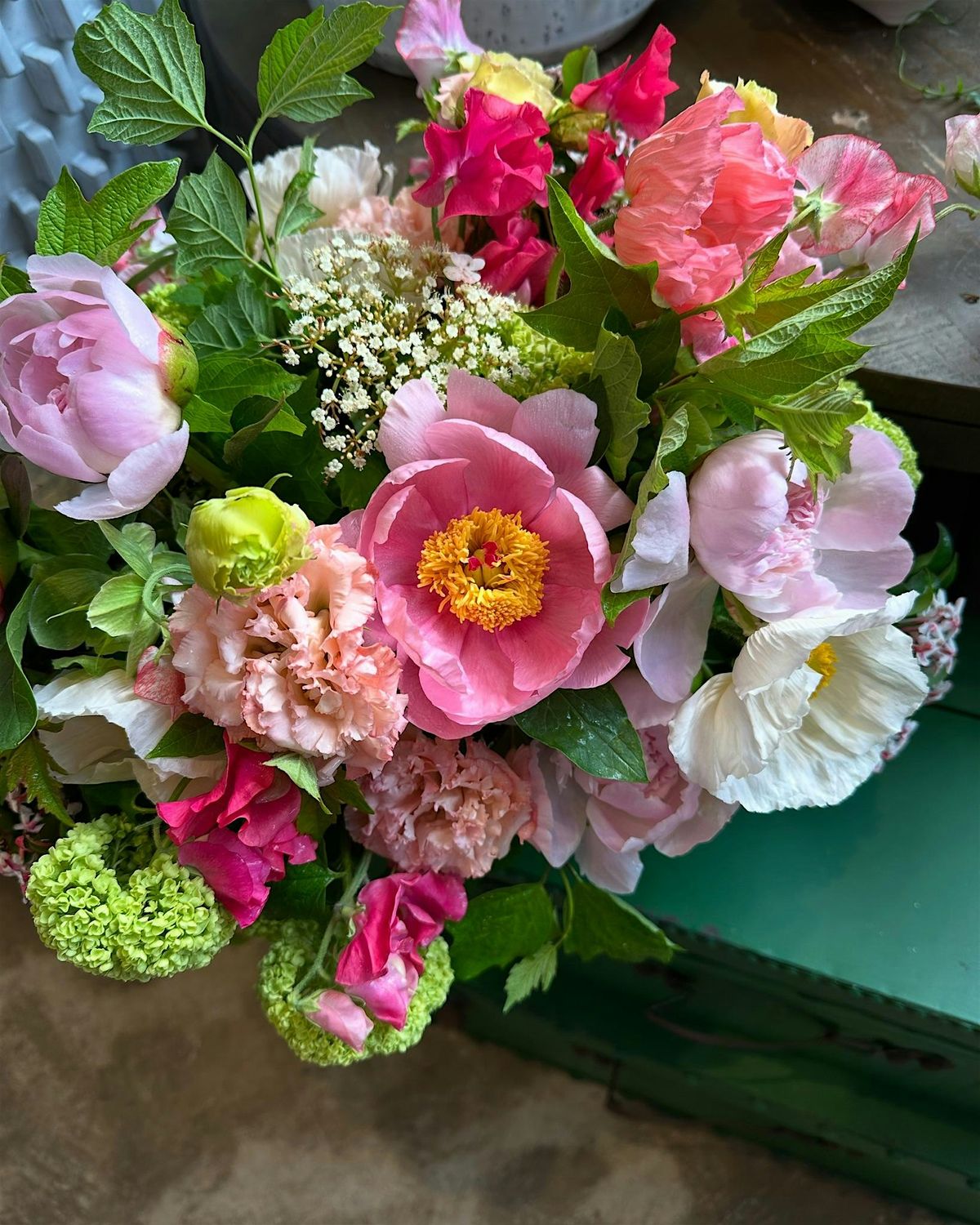 Each class revolves around a theme or type of flower. For example, ‘Peonies’ or ‘Jewel Toned Blooms’. The images on our website are representative of what a design might look like, but are not exact. In order to get you the most product, we hold off on ordering until a week before class to see what is available at the best price from our wholesalers. In classes that revolve around a certain flower, such as peonies, you can expect to be making a mixed bouquet highlighting that flower.