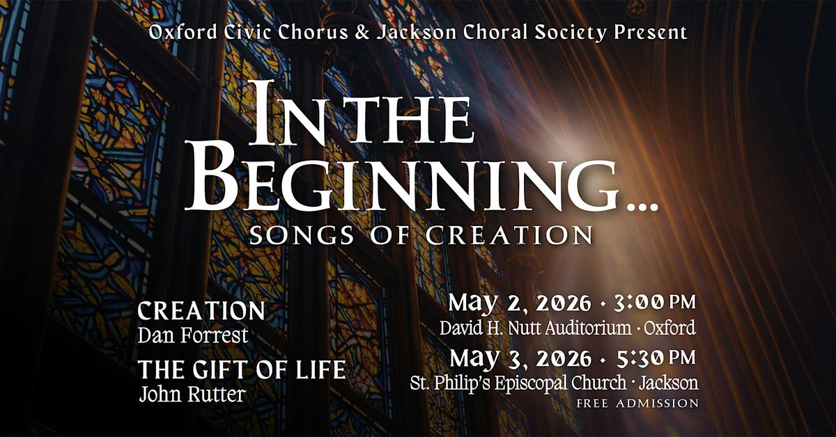 The Creation Suite, by Dan Forrest and John Rutter's The Gift of Life. Don't miss this wonderful music! The Jackson Choral Society, joined by the Oxford Civic Chorus, will perform in Jackson, on May 3rd, 5:30 PM at St Philips Episcopal Church on Old Canton Rd.