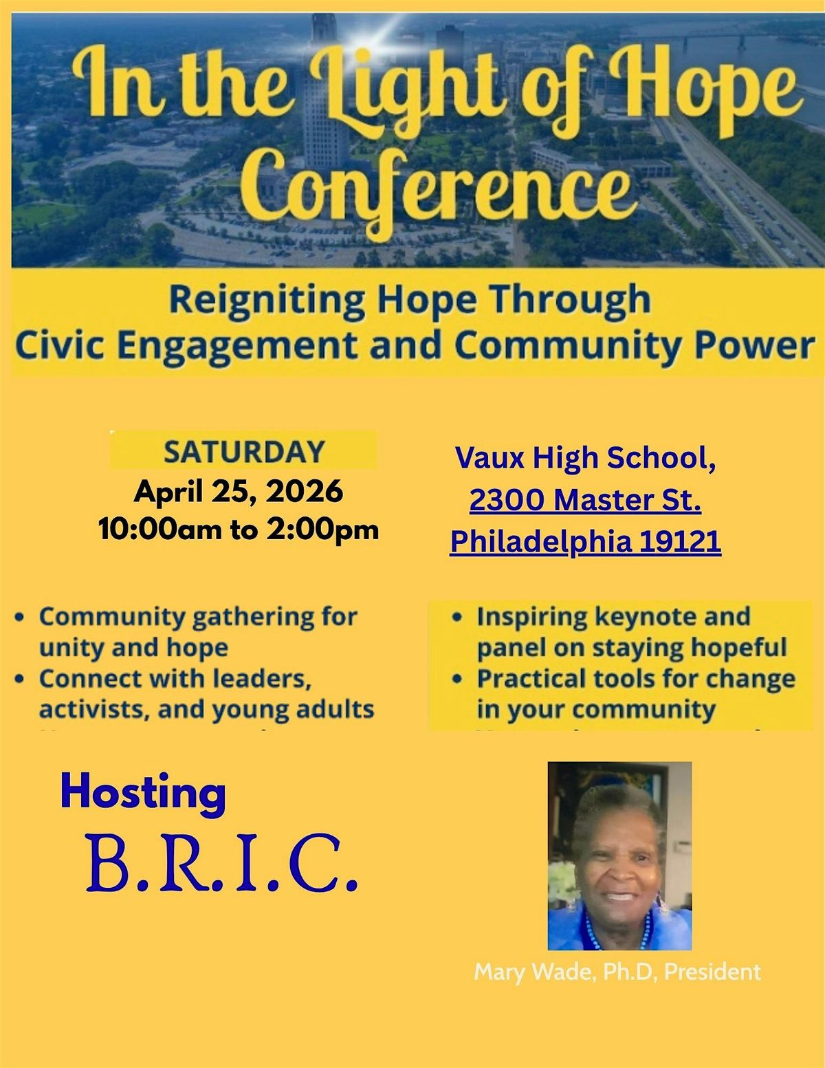 Reigniting Hope through civic engagement and Community Power. Sat. April 25th, 10:am to 2:00pm at Vaux High School in Philadelphia PA Free.Agenda