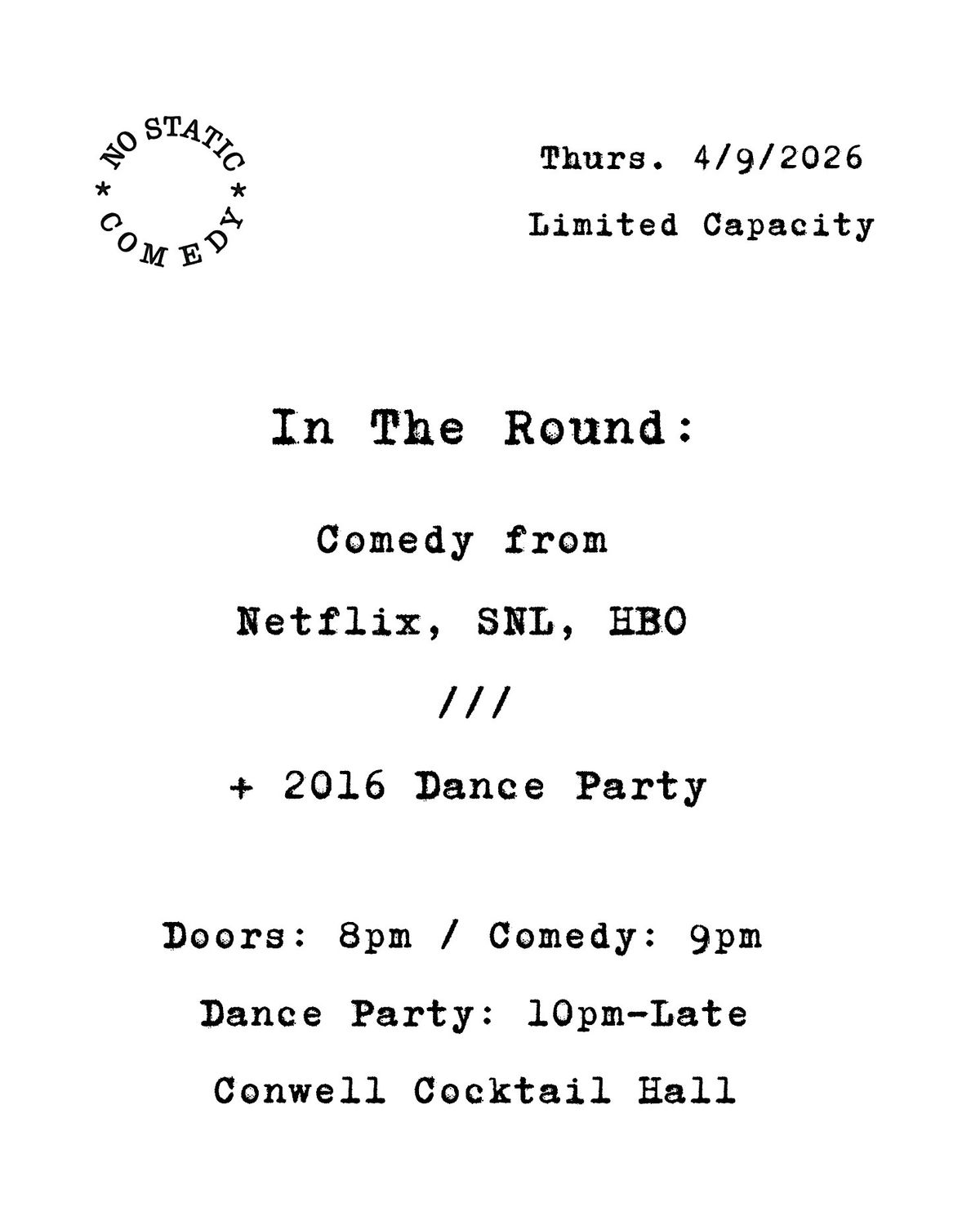 This is an In The Round, standing-room only comedy show that launches directly into a 2016 themed dance party within The Ballroom of Conwell Cocktail Hall.
