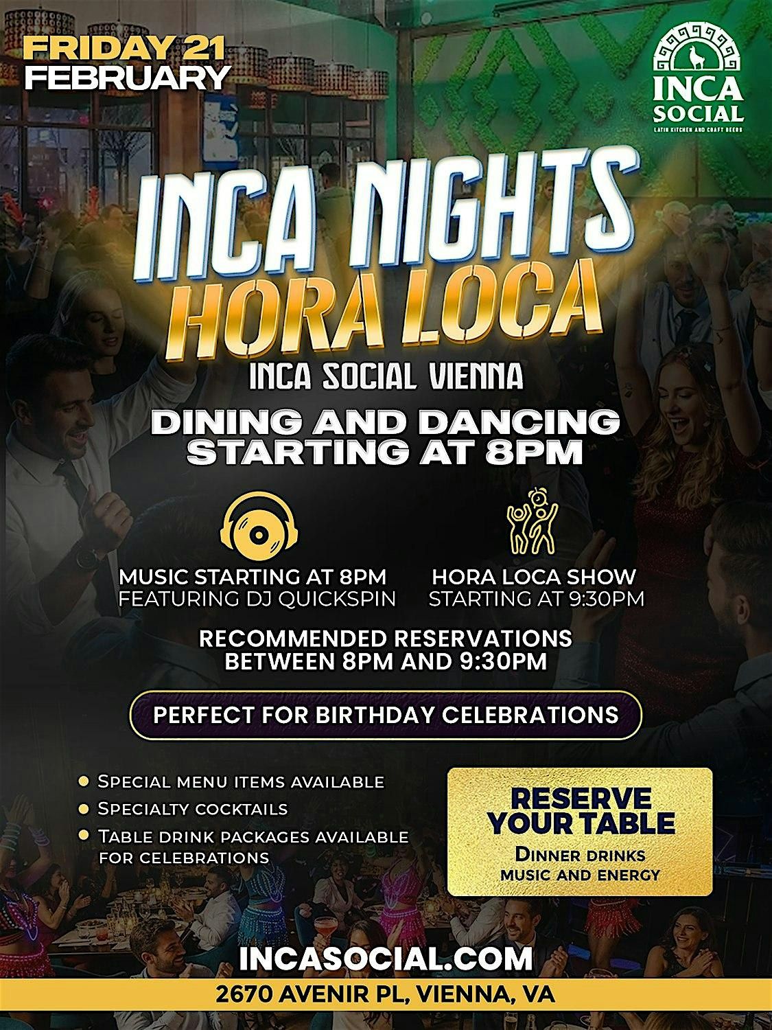Celebrate Saturday night at Inca Social Vienna with INCA NIGHTS featuring our high energy HORA LOCA show, live music, and nonstop vibes. This is the perfect night out for birthdays, group celebrations, date nights, or anyone looking for dinner, a show, and dancing all in one place.