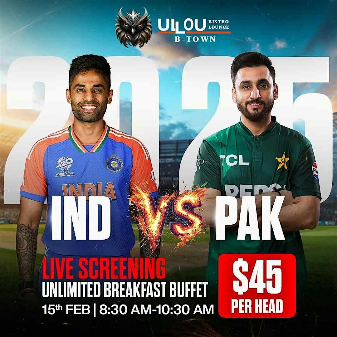 Watch the biggest cricket rivalry live — India 🇮🇳 vs Pakistan 🇵🇰 — at Ullou Lounge B-Town, 1510 Drew Road, Mississauga, on Sunday, Feb 15 at 8:30 AM with unlimited breakfast and the biggest screens in the GTA. Enjoy stadium-style sound, premium seating, electric crowd vibes, and full desi energy. Start your morning with great food, thrilling moments, and unforgettable match-day atmosphere. Perfect for friends, families, and cricket lovers. Limited seats available — book now on Eventbrite and be part of the ultimate live screening experience!