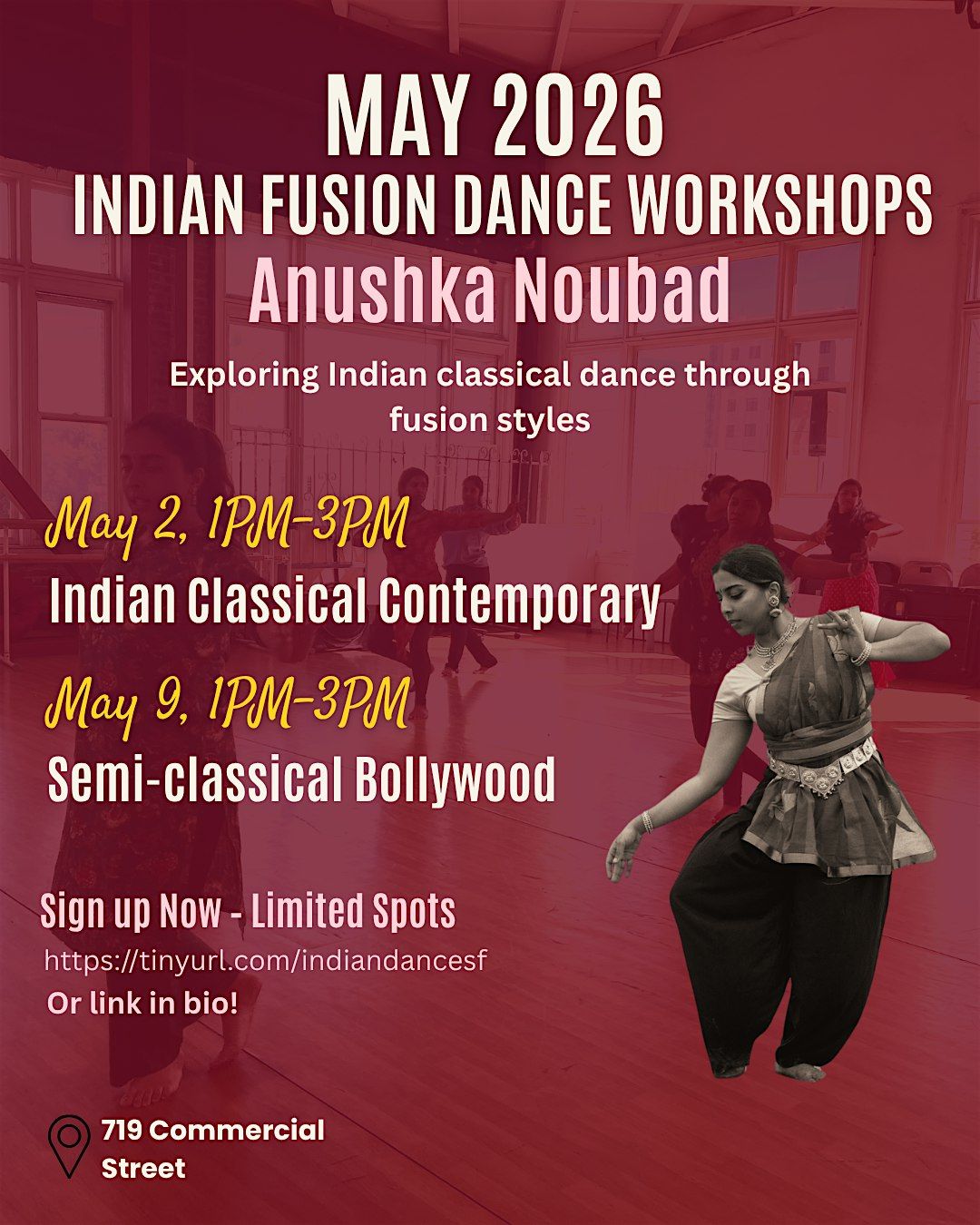 In this workshop, we'll explore the exciting intersection of contemporary and modern dance forms with Indian classical styles like Bharatanatyam. You'll work on foundational techniques from both styles while learning a fun, dynamic fusion combo that blends tradition with modern movement.