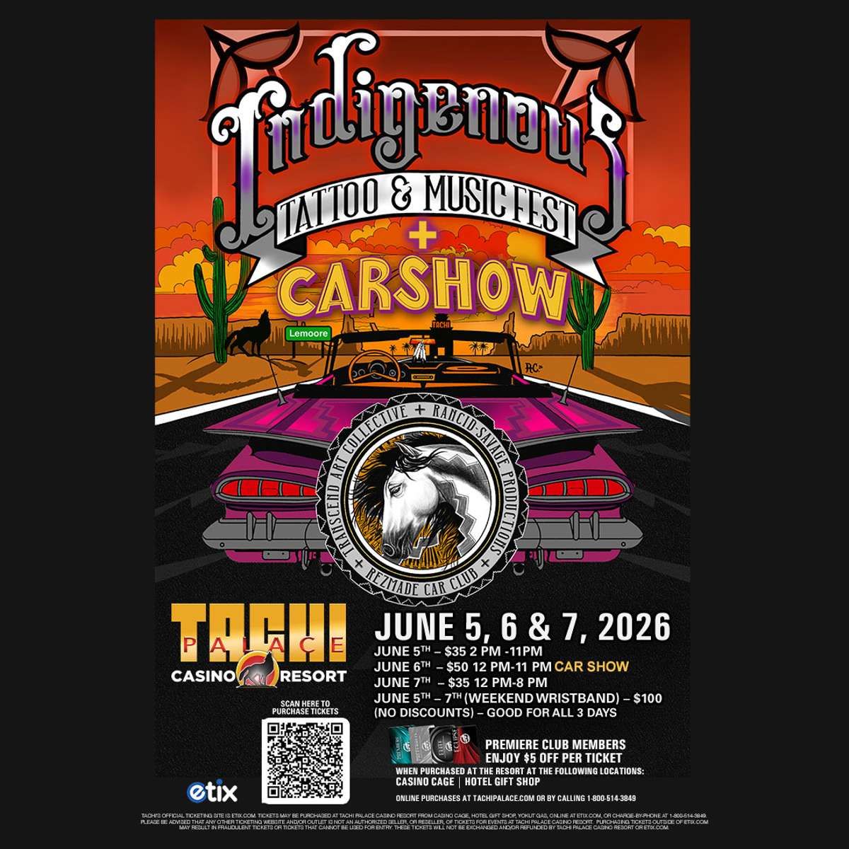 🌟 Step into a world of wonder at Indigenous Tattoo Music Fest and Rez Made Car Show, where extraordinary moments await! 🏛️ Located at Tachi Palace Hotel & Casino in dynamic Lemoore, CA, this event will become the talk of the town. 📅 Join us on June 4th, 2026 at 04:00 PM for a celebration that defies the ordinary. ✨ This curated experience brings together the best of entertainment, culture, and community spirit. Every detail has been thoughtfully planned to ensure an unforgettable experience for all our guests. 🎯 Take advantage of this opportunity to be part of something special. 🎊 Early registration is recommended as space is limited!http://maps.seatics.com/GeneralAdmissionEvent_2025-02-25_1549_10012025_121152_SVGC_tn.png