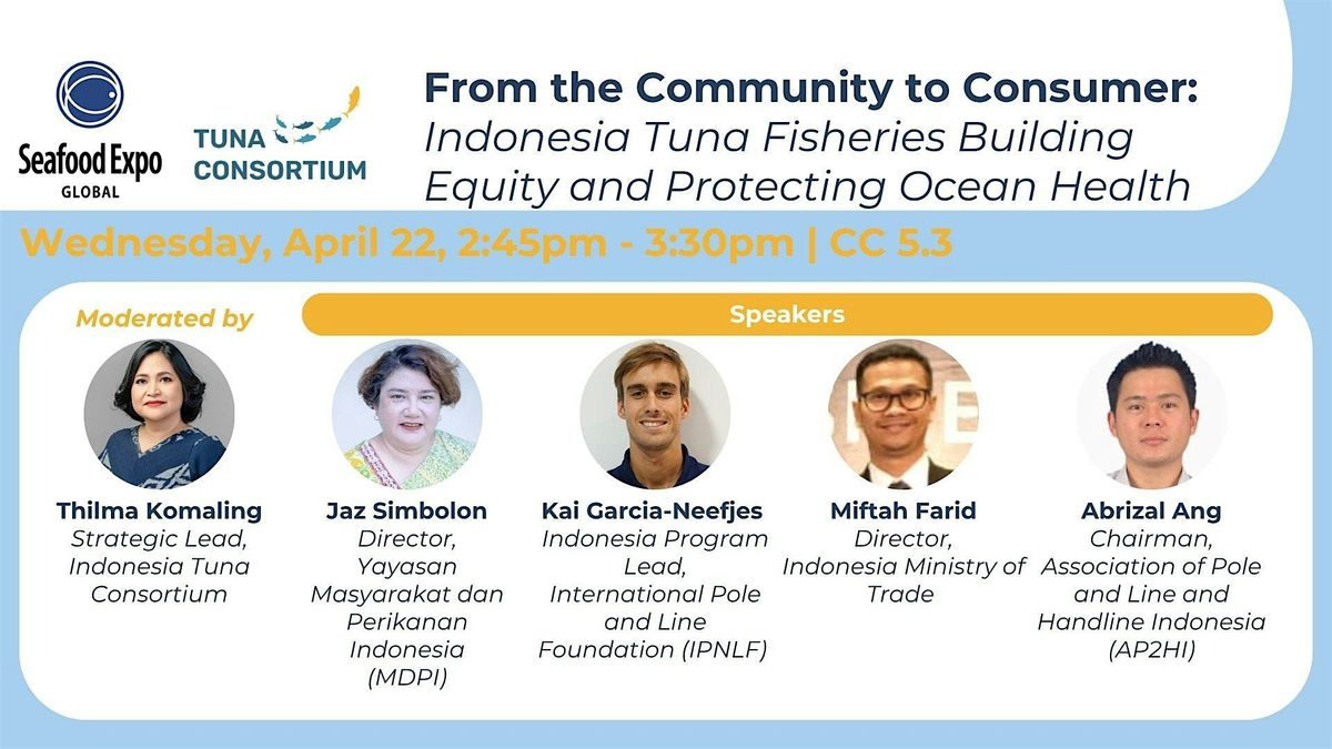 This session, hosted by the Indonesia Tuna Consortium—a coalition of five organizations dedicated to coordinated fisheries management and the development of a sustainable Tuna Harvest Strategy—will examine how Indonesia is creating a sustainable and equitable fisheries model that empowers fishers and coastal communities, while also aligning with conservation goals and global standards for sustainability and product quality. Representatives from Indonesia’s tuna industry, government, and non-profits will showcase their collaborative efforts and innovations to support fishing communities, conserve tuna stocks, and meet the growing demand for both sustainable and ethically sourced tuna.