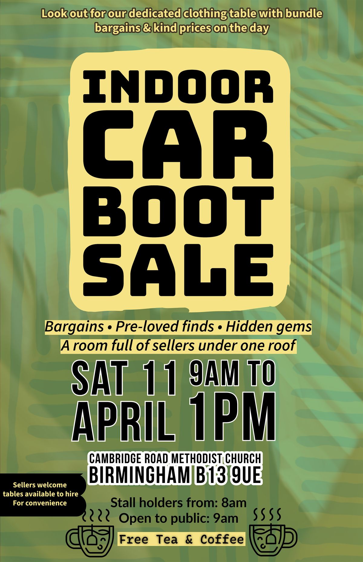 Join us for a friendly indoor car boot sale packed with bargains, pre-loved finds and hidden gems from a variety of sellers.