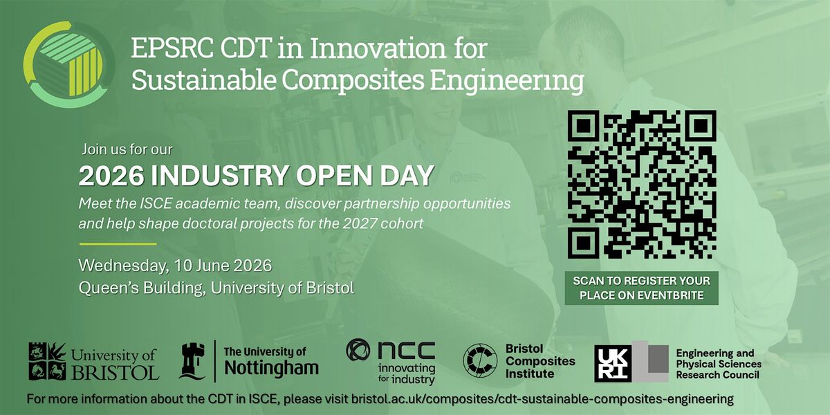 This in-person event, hosted at the University of Bristol, offers current and prospective industrial partners the opportunity to learn how the CDT works with industry to support innovative research in sustainable composites. Attendees will explore sponsorship opportunities, engage with current partners and the academic team, and contribute to shaping project proposals for the 2027 cohort of doctoral students. As part of the programme, we encourage attendees to take part in a series of two-minute lightning talks — an opportunity to introduce a research challenge, spark discussions and connect with others who share similar research interests.