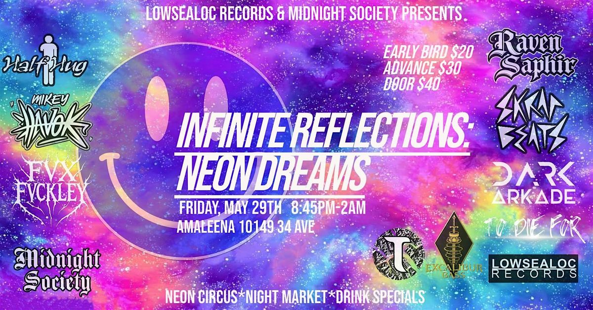 INFINITE REFLECTIONS: NEON DREAMS Step into the mirror. The Technicolor neon dreams of the Underground at our new venue Amaleena Events.Infinite Reflections: Neon Dreams is the next chapter in the Lowsealoc × Midnight Society lineage — a Neon‑Blacklight descent into the dream architecture of the night. A world built on bass, dance & occult‑tech visuals that bend perspective and distort reality.Bass Alchemists: Mikey Havok, To Die For, Dark Arkade, Skrapbeats, Raven Saphir, Fvx Fvckley & Half Hug.Midnight Society Night Market. Neon Circus Performing Artists. Neon & White Dress Code. Drink Specials.This isn’t just a show.
